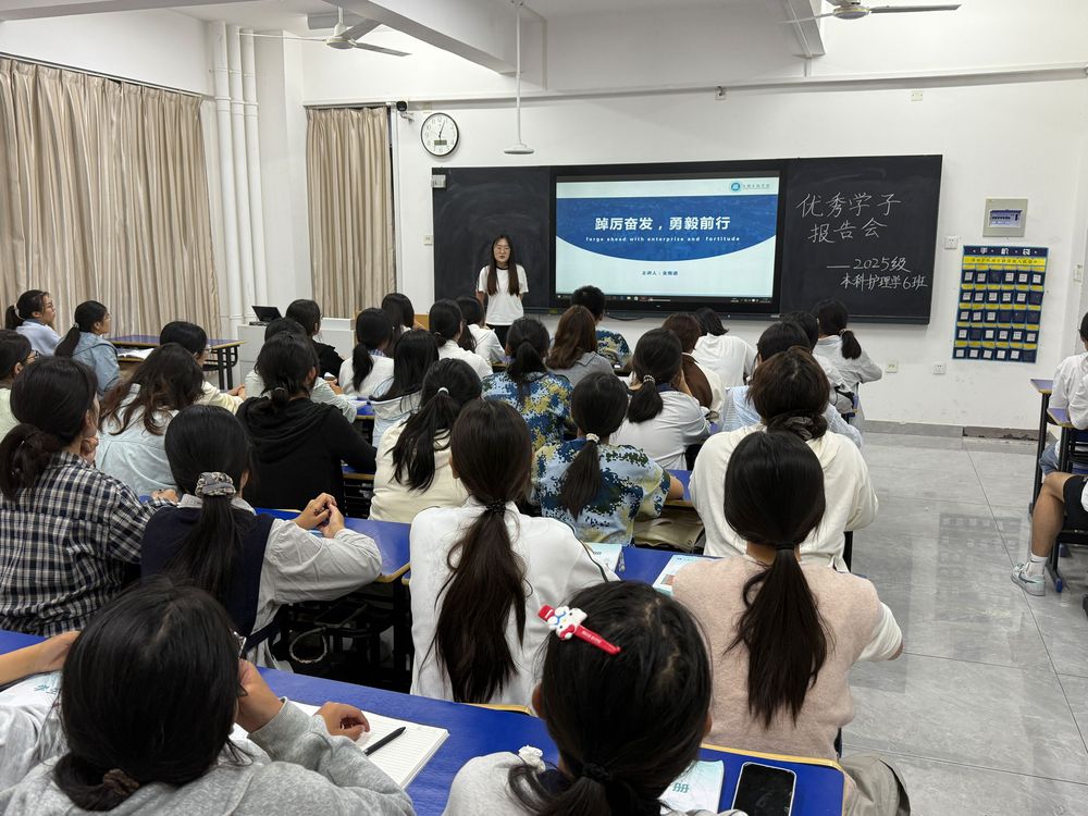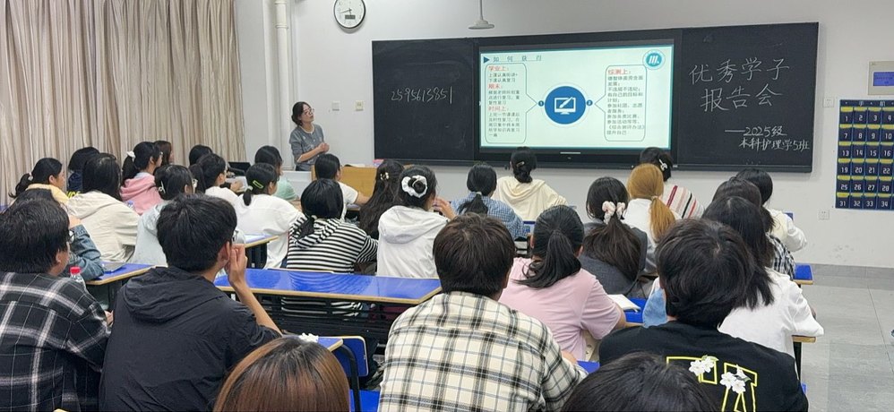 为发挥优秀学子榜样力量,帮助学弟学妹明确学习方向、规划大学生涯,学院邀请两名优秀学生谭雨甜、金雨诺在康养2号楼303教室开展优秀学子事迹报告会,2025级本科护理学5班和6班的全体新生参加。