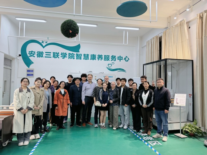 访问期间,派维・哈霍一行参观安徽三联学院智慧康养服务中心。在随后的座谈会上,现代康养产业学院副院长李凌峰详细介绍了现代康养产业学院的办学定位、学科设置、师资力量、人才培养模式及产学研合作等具体情况,重点阐述了我校在康养领域的办学特色与优势。派维・哈霍介绍了赫尔辛基城市应用科学大学的发展历程、优势专业、国际交流合作成果及福祉领域的科研方向等内容,她表示,安徽三联学院在康养产业领域的办学理念与实践经验令人印象深刻,与她们学校的发展方向高度契合,具备开展深度合作的良好基础。