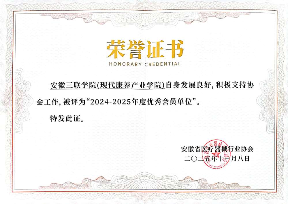 近日,安徽省医疗器械行业协会公布2024-2025年度优秀会员单位评选结果,现代康养产业学院凭借在产学研融合、行业标准建设及健康服务创新等领域的突出表现,成功获此殊荣。
