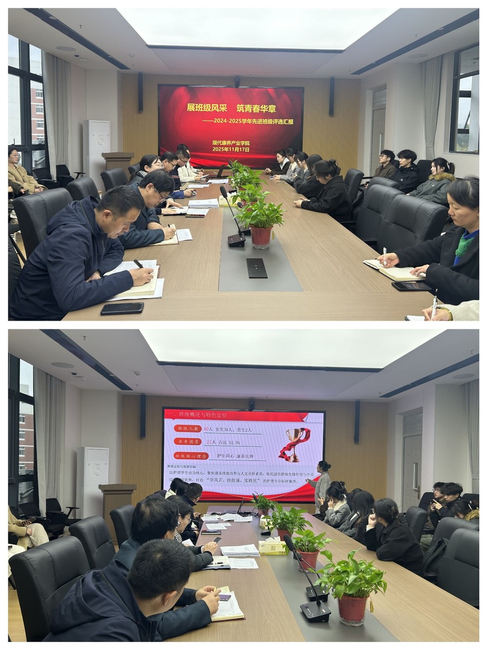 为进一步激发班级凝聚力,展现学院学子青春风貌,11月17日中午,学院在202会议室组织开展 2024-2025学年先进班级评选会。副校长、现代康养产业学院院长宋梦岚,学院其他领导班子成员、管理干部、全体辅导员和学生代表参会。