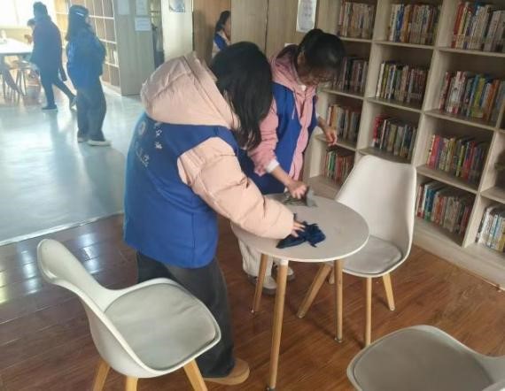 活动现场,志愿者们分工协作,手持清洁工具对场地内的桌椅、书架等公共设施进行细致擦拭,认真清理角落的灰尘与杂物,将散落的书籍归置整齐。大家以饱满的热情投入劳动,不放过任何卫生死角,原本略显杂乱的区域在志愿者的努力下变得干净整洁。过程中,志愿者们相互配合、高效行动,充分展现了青年群体的协作意识与责任担当。