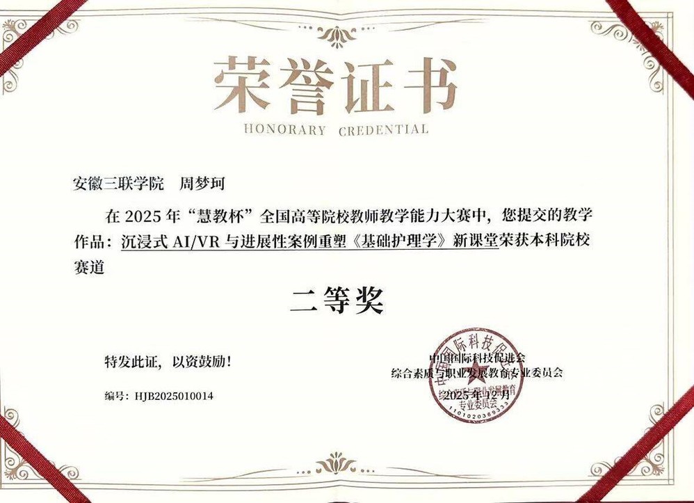 大赛启动后,学院高度重视,精心遴选骨干组建团队,提供全方位指导保障。参赛教师立足康养专业特色,将专业知识与智慧教学方法深度融合,展现过硬能力与创新思维。其中,刘群获一等奖,汤丽娟、周梦珂获二等奖,李儒婷、冷娟娟获三等奖。成绩的取得,既是教师个人努力,也是学院深耕教学改革、强化师资建设的体现。