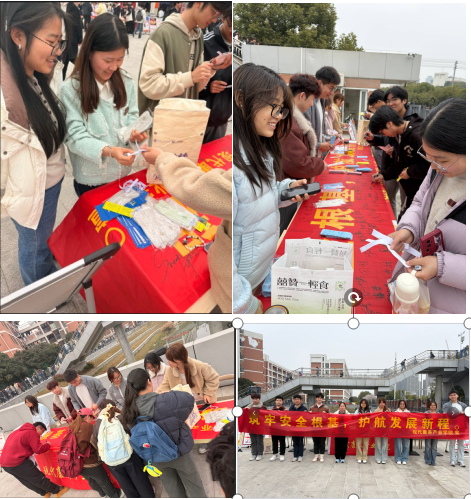 活动现场氛围热烈,学院精心准备的安全书签备受欢迎,书签涵盖消防安全、交通安全、反诈防骗、实验室安全等多领域实用知识,让师生在细微处汲取安全养分。现场设置的安全知识有奖问答环节,通过互动形式普及安全法规与应急常识,激发师生参与热情。同时,活动准备了铅笔袋、卡套、笔记本、口罩、书签等小赠品,为参与师生送上暖心关怀。此外,现场还悬挂了宣传条幅,师生们纷纷在条幅上签名承诺,以实际行动践行安全责任。