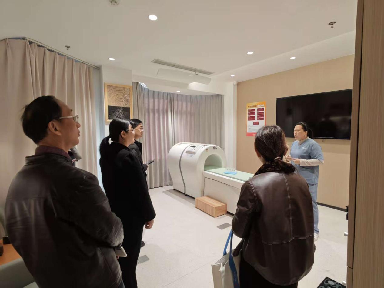 学院团队重点调研并体验了中心核心康养设备,中心运营方与三联学院就热疗、艾灸等领域的技术研发与应用展开深度交流,三联学院介绍了自身在射频灸疗、内透热热疗领域的研发成果,该技术源于军工医疗器械研发,现为民用大健康领域,设备具备 “设备不发热、人体直接感热” 的内透热特性,可调理下焦问题(男性生殖、女性盆底肌松弛、痔疮等),通过热 / 非热结合模式提升人体微循环,同时全身热疗设备可实现细胞运动,达到减脂、调理身体的效果,90 岁长者日常使用后血压有明显改善。