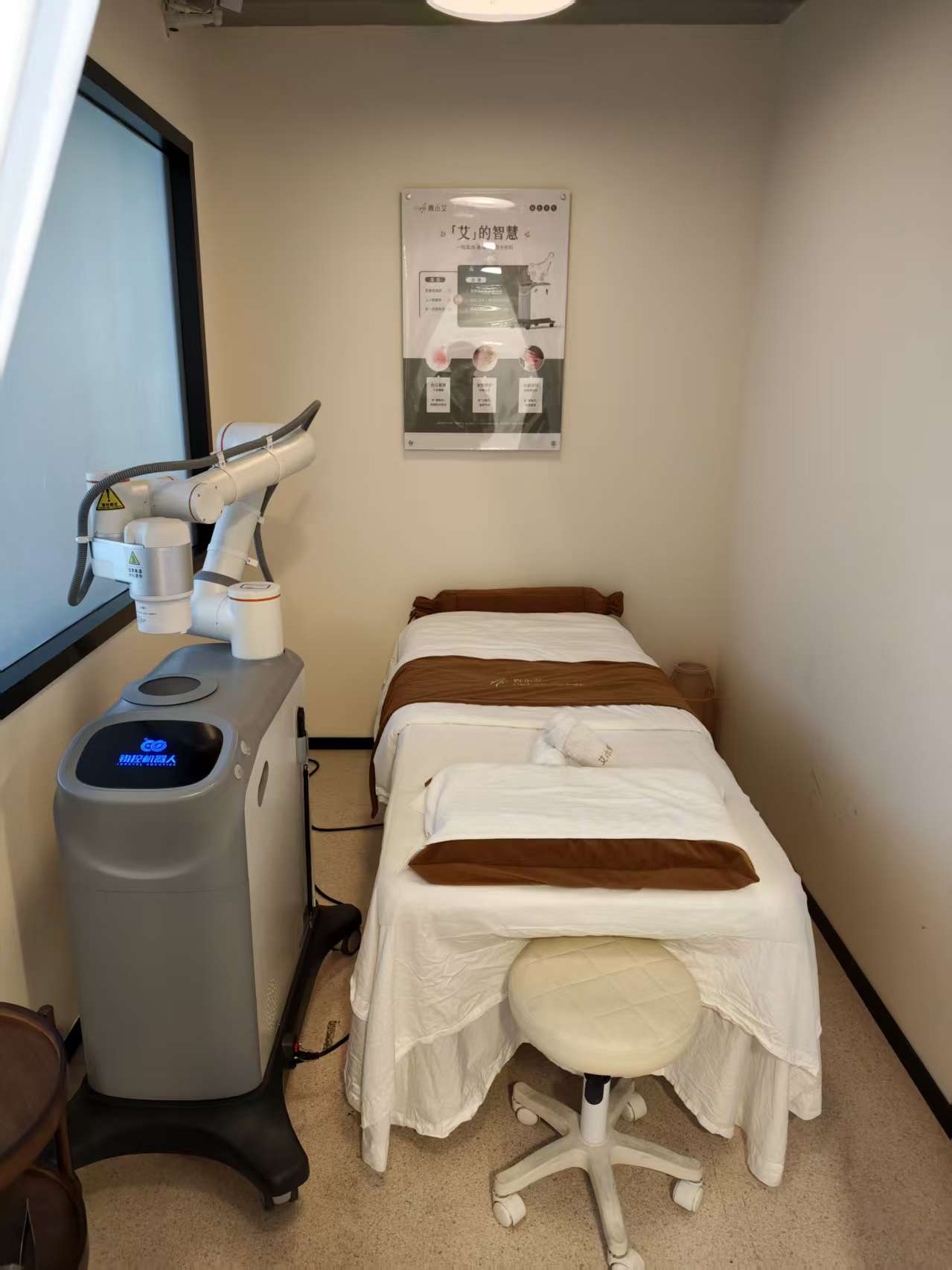 机器人艾灸:全流程无人工操作,通过 iPad 识别老人九大体质并匹配穴位,明火艾灸的机械臂可随老人身体浮动自动调节距离(距皮肤 10 公分),具备防烫功能,三伏天服务满员。