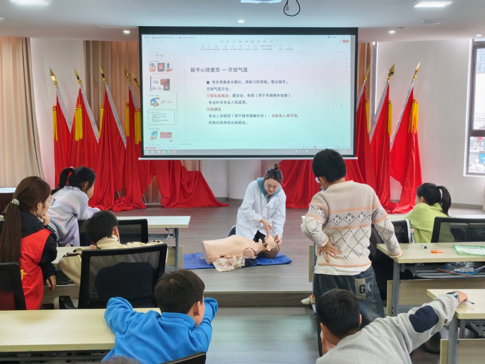 学习急救知识,守护生命安全。在应急救护知识培训课堂上,教工党员中的专业教师负责理论讲解与操作示范,学生党员则分组指导孩子们进行实操练习,协助纠正动作。通过理论讲解、现场演示、实操指导相结合的方式,孩子们认真聆听、积极互动,切实掌握了实用的自救互救本领,提升了应对突发状况的应急处置能力。
