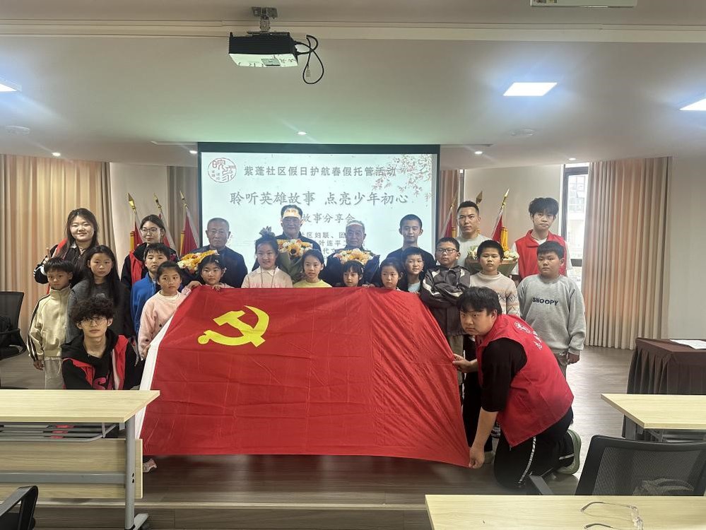 聆听英雄故事 点亮少年初心。在主题分享会上,教工党员与社区老党员为孩子们讲述英雄事迹,一段段感人至深的红色故事,让在场青少年深刻感悟先辈们的爱国情怀与奉献精神。活动现场,大家共同举起党旗合影留念,在庄重的氛围中接受红色教育,将爱国种子深植心中。