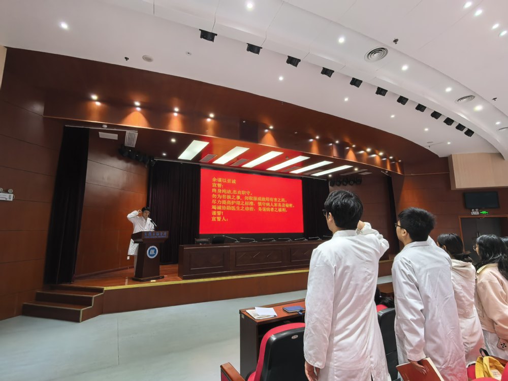 会上,教学主任张晓玲围绕毕业论文的重要性、写作要点、时间进度、过程管理、成绩评定及注意事项等方面展开重点讲解,为学生高质量完成毕业论文提供了清晰指引。教学主任郭洪霞强调了毕业综合实习的重要意义,详细介绍了校友邦实习系统的操作流程、使用要求及管理规范,以保障实习过程的规范化与有序化。随后,实习生代表上台发言,分享实习规划与成长期许,并带领全体实习生庄严宣誓,展现了护理学子严谨务实、担当奉献的职业信念。最后,金华作动员讲话。他强调,所有即将进入临床实习的同学要严守纪律规矩,筑牢安全底线;保持虚心态度,勤学善思多问;恪守严谨作风,坚守职业初心;发扬吃苦精神,勤于动手实干,为自己争光、为学院添彩。